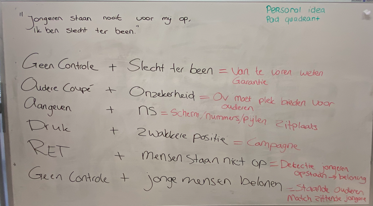 Tijdens mijn internationale Design Challenge heb ik samen met mijn team een ontwerp gemaakt voor de NS. Vanuit de ontwerpvraag 'Design a solution that addresses socially unsafe situations and practices that occure in society' hebben wij door verschillende creatieve technieken, zoals een mindmap en de personal idea pad quadrant gekozen om een oplossing te bedenken voor mensen in de trein, wie een zitplaats (of hulp) nodig hebben, maar dit niet durven te vragen wegens agressieve reacties. Hiernaast zijn onderdelen van dit proces weer gegeven. Zo heb ik gewerkt aan Persona's en Customer Journey's. En heb ik deze volgens onze huisstijl weergegeven. Deze methodes heb ik kunnen inzetten nadat ik met onze doelgroep interviews heb gehouden.
